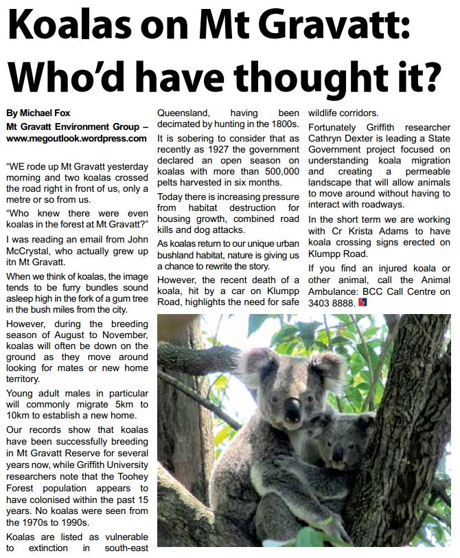 John grew up on the side of Mt Gravatt and he had never heard of Koalas on the Mountain. I have heard from others that there have “never been” Koalas on Mt Gravatt and any animals found must have been relocated there after recovery from injury. This has always seemed to be an unlikely explanation because injured animals, including Koalas, are returned to locations as close as possible to where they were found.