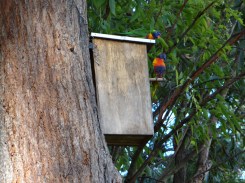 First order of the day was a sausage sizzle, a very new and Australian experience for Lin, Environmental Science, and Fred, Hotel Management. Marshal operated the BBQ while I show the team the Rainbow Lorikeets Trichoglossus haematodus setting-up home in the Men’s Shed nest-box high in a Tallowwood.