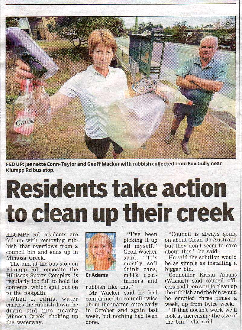 Geoff and Jeanette are proud of our community and take great pride in their part of the Fox Gully corridor. So it is understandable that they get a bit frustrated with the careless behaviour of individuals rubbishing our streets, particularly when that rubbish will be washed into peaceful Mimosa Creek.