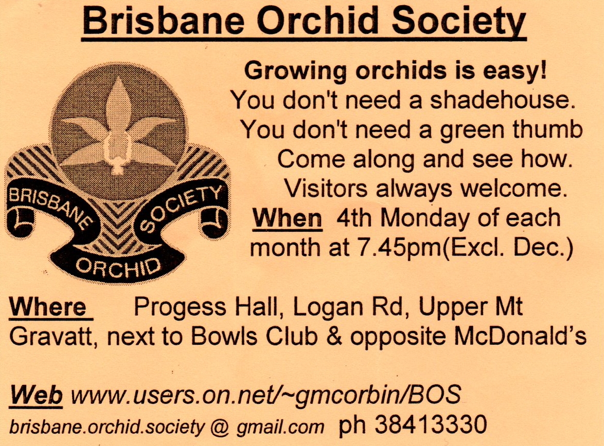 Brisbane Orchid Society meet regularly at the refurbished Progress Hall, Upper Mt Gravatt – 4th Monday month at 7:45Pm.