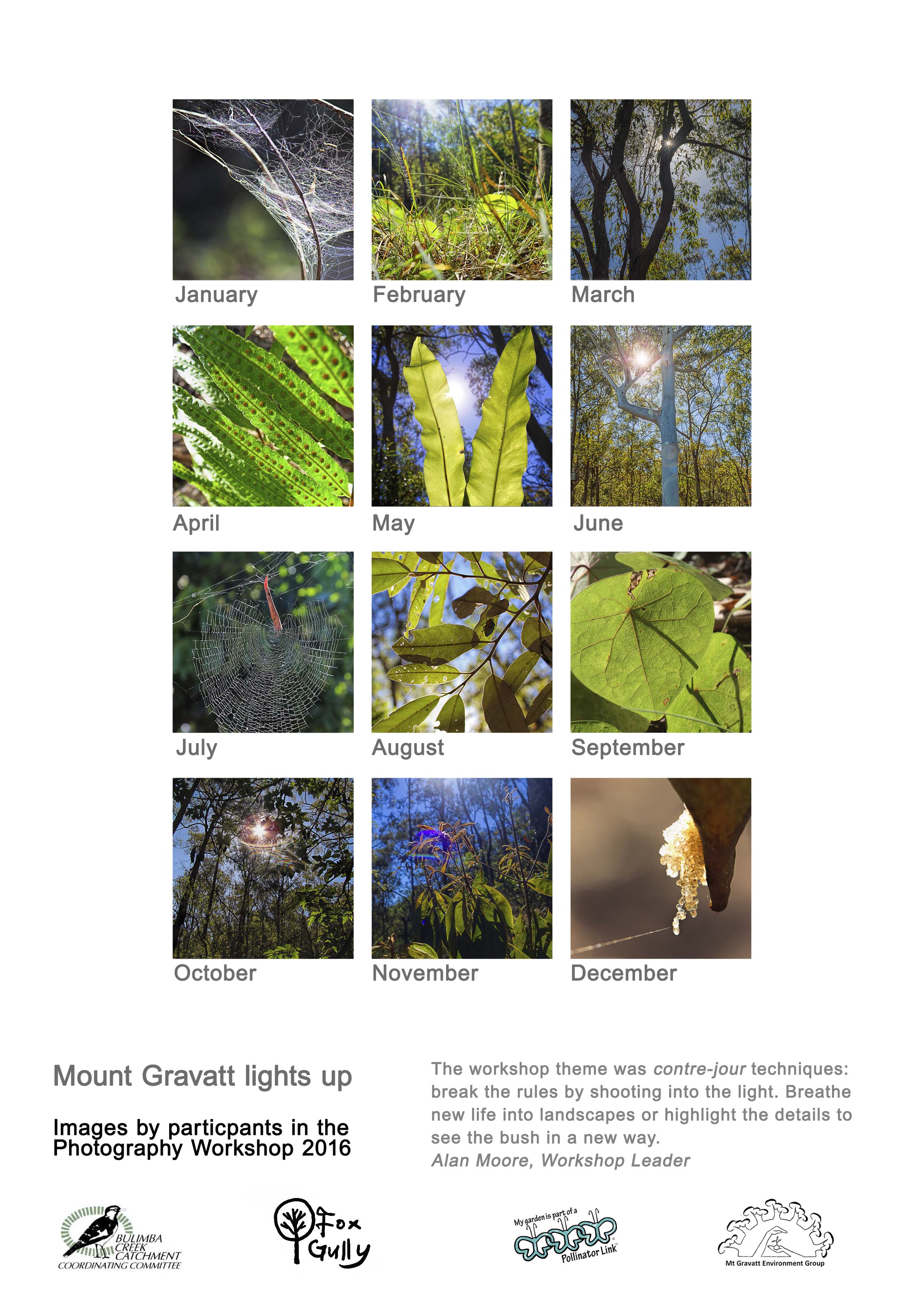 The 2016 Photography Workshop was called Mount Gravatt lights up, so workshop leader, Alan Moore, has selected participants photos that show contre-jour techniques. Contre-jour techniques break the rules by shooting into the light. The photos chosen breathe new life into how we see the world around us in a new way.![]()