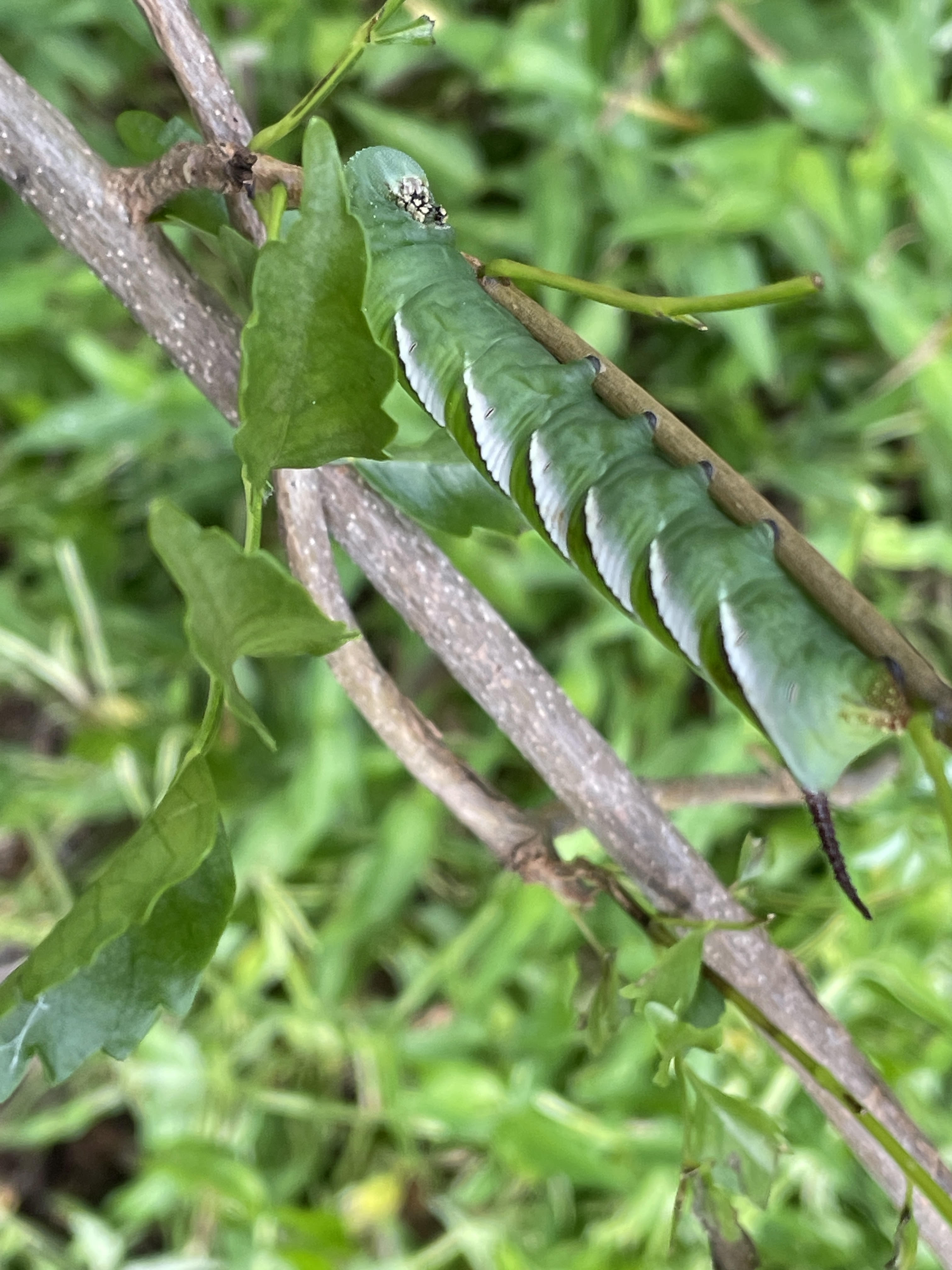 We found the Privit Hawkmoth Psilogramma casuarinae caterpillar feeding on the Bower Vine Pandorea jasminoides.