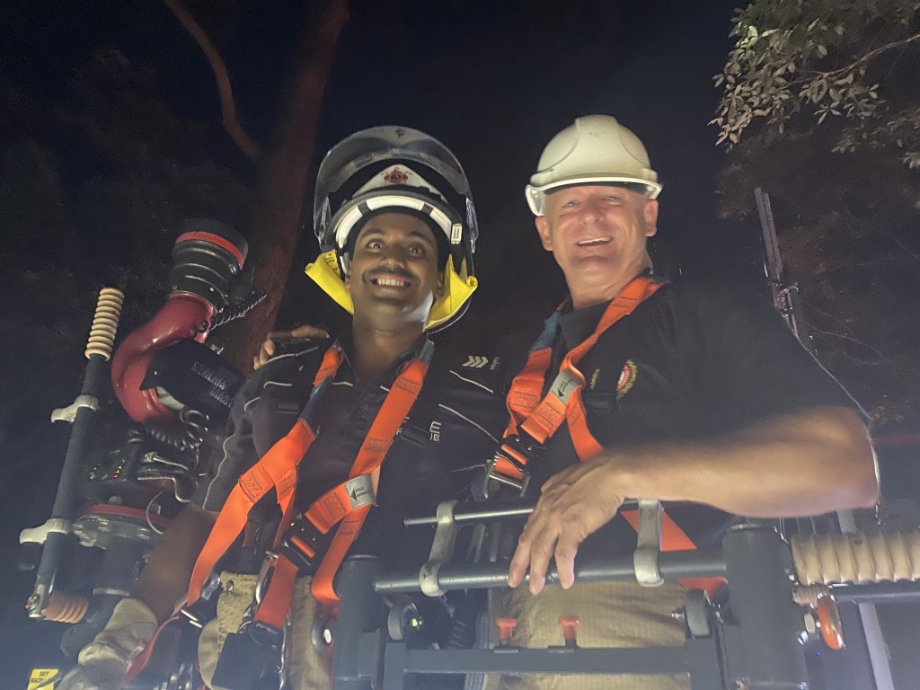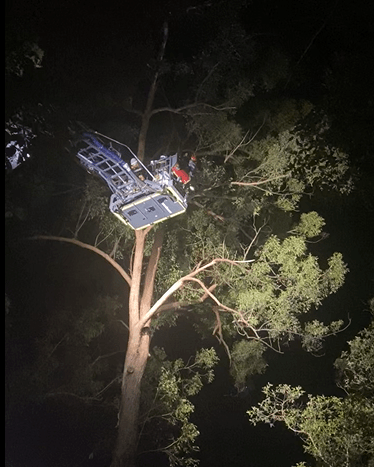 Time to call in the rescue at height experts. A real community effort. High lift fire brigade bucket trucks arrived: Luna from Roma Street and Juliette from Wishart Station.