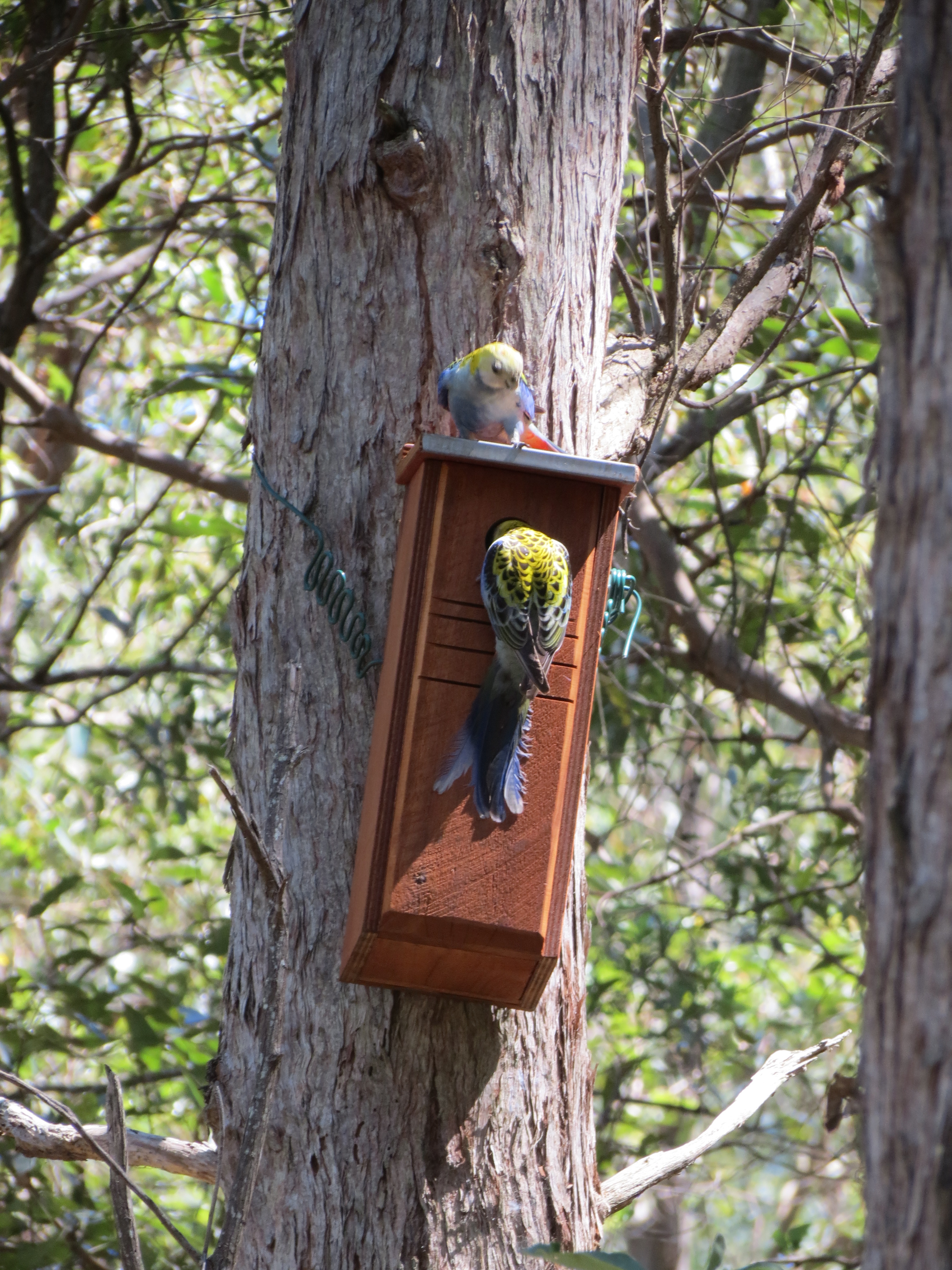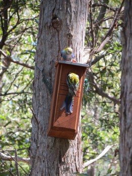 We had a day of inspections today with a pair of Pale-headed Rosellas checking out prospective new homes. Unfortunately they started with two boxes designed for Scaly-breasted Lorikeets. The smaller entrance diameter means the boxes are kept available for these smaller birds that are losing out on breeding sites with resulting drop in numbers.