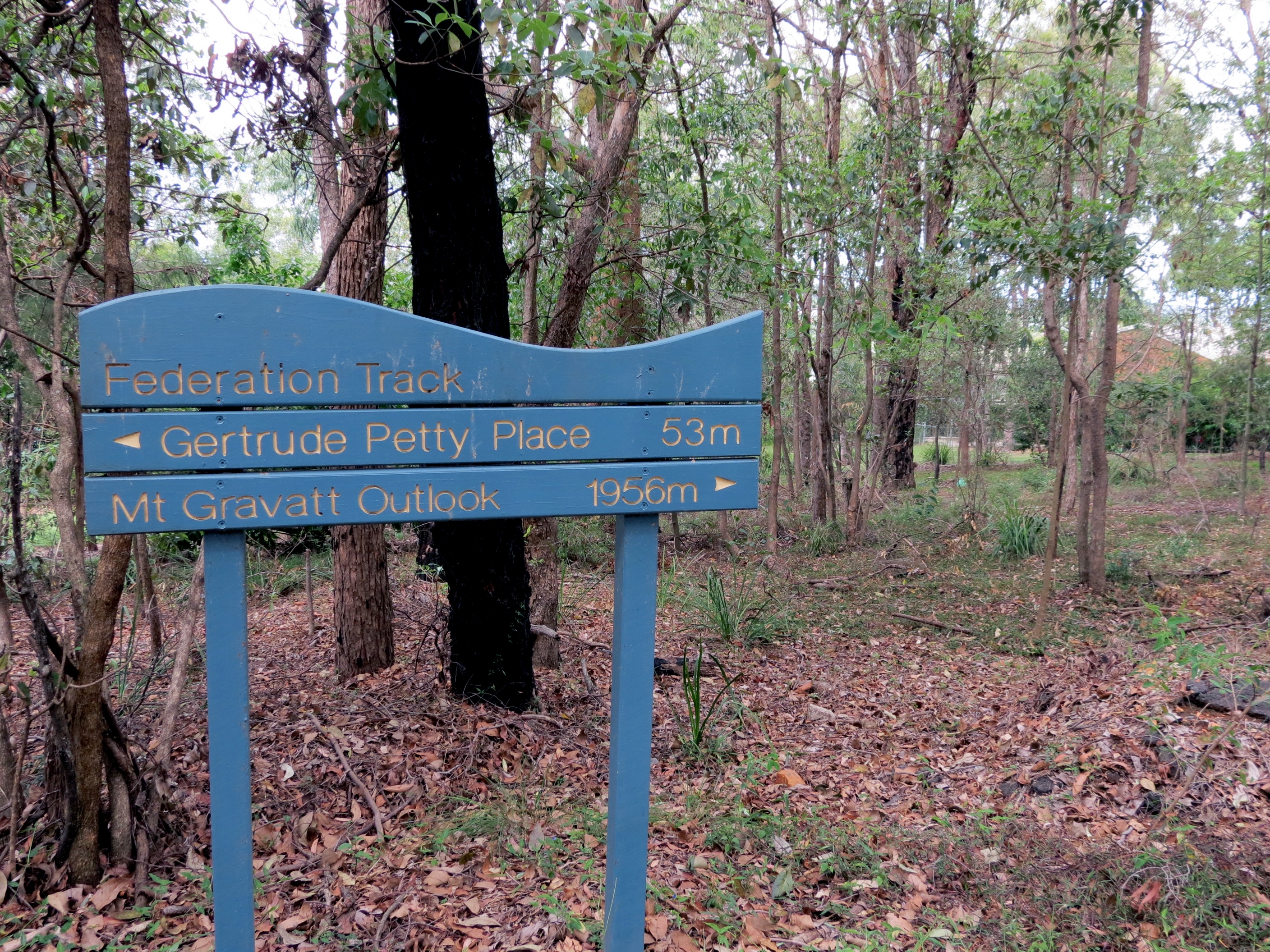 This week I walked the Mt Gravatt Lookout Look starting at Gertrude Petty Place I followed the Federation Track. The track leads through the Gertrude Petty Place Bushcare site where a group led by Sue Jones has been removing weeds and restoring native grasses, vines and trees.